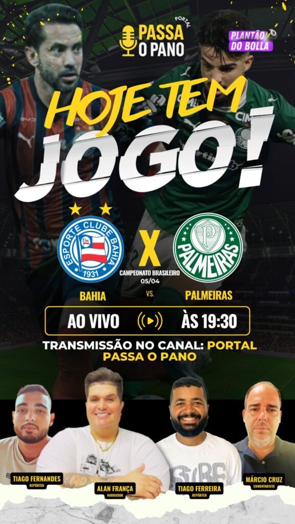 É dia de duelo gigante no futebol brasileiro! O Esporte Clube Bahia encara o Sociedade Esportiva Palmeiras hoje, na Arena Fonte Nova, e você acompanha TUDO AO VIVO na transmissão do canal Passa o Pano no YouTube!