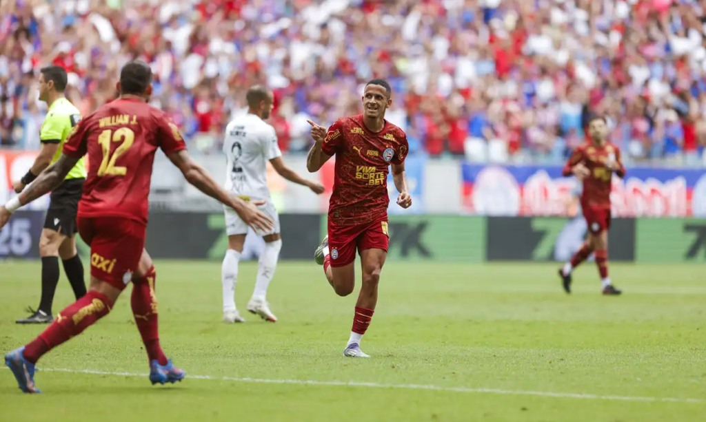 O Bahia derrotou o Santos por 2 a 0, neste domingo (24), na Arena Fonte Nova, e consolidou sua posição entre os primeiros colocados do Campeonato Brasileiro. Os gols do triunfo, válido pela 21ª rodada, foram marcados por Luciano Juba e pelo uruguaio Lucho Rodríguez. Com a segunda vitória seguida, o time comandado por Rogério Ceni chegou aos 36 pontos, assumindo a 4ª colocação e ganhando força na briga por vaga na próxima edição da Copa Libertadores. Já o Peixe segue pressionado, perto da zona de rebaixamento, em 15º lugar com 21 pontos.