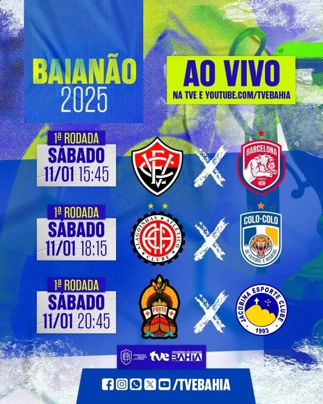 A disputa pela taça do Campeonato Baiano de Futebol de 2025 começa neste sábado (11), com transmissão exclusiva da TVE. Os 10 clubes que estão na disputa pelo título da primeira divisão são Atlético, Bahia, Barcelona de Ilhéus, Colo-Colo, Jacobina, Jequié, Juazeirense, Porto e o atual campeão Vitória. Os torcedores podem acompanhar todos os jogos do Baianão ao vivo pela TVE e também pelo youtube.com/tvebahia.