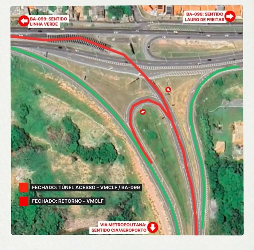 Motoristas que precisarem acessar a BA-009 ou realizar o retorno devem seguir até Lauro de Freitas e fazer o primeiro retorno no sentido da Linha Verde.