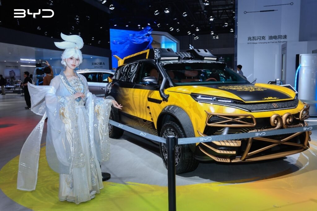 Um dos grandes destaques em Xangai foram justamente os novos modelos HAN L e TAN L, apresentados ao lado de um veículo modificado co-branded, criado em colaboração com o jogo Black Myth: Wukong. Essa versão especial une o espírito heróico do Rei Macaco com o design icônico Dragon Face da BYD, entregando uma narrativa e estética profundamente chinesas e únicas.