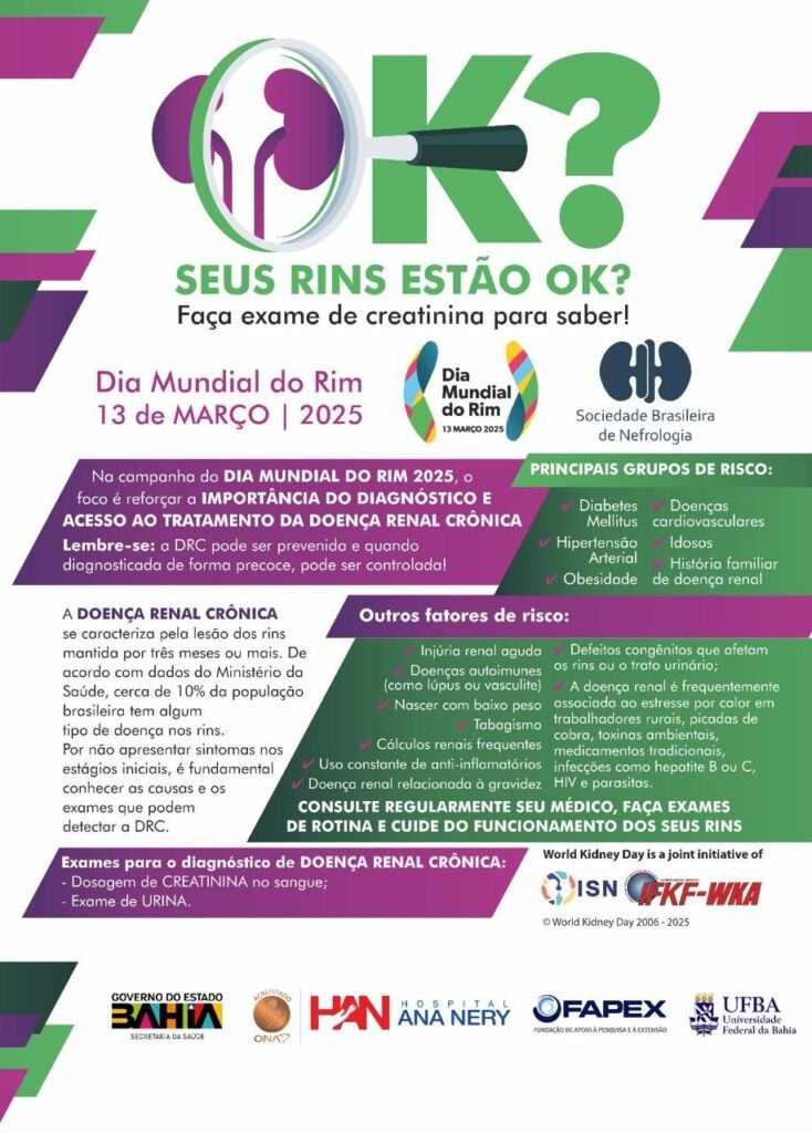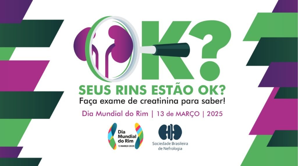 É com grande entusiasmo que lançamos a Campanha do Dia Mundial do Rim 2025 e acreditamos no sucesso dessa ação, que completa 19 anos. Anualmente, a Sociedade Brasileira de Nefrologia coordena no Brasil a Campanha do Dia Mundial do Rim, que tem como objetivo disseminar informações sobre as doenças renais, com foco na prevenção, diagnóstico precoce e tratamento adequado. O objetivo está resumido no tema da campanha em 2025, que é “Seus rins estão ok? Faça exame de creatinina para saber”.