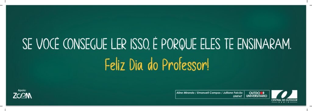 O grupo se classificou para a final na etapa sobre o Dia do Professor. Na peça, elas utilizaram uma lousa com fundo verde e uma frase escrita com giz: “Se você consegue ler isso, é porque eles te ensinaram – Feliz Dia do Professor!”. Outdoors com a arte já estão nas ruas de Salvador, celebrando a data. E agora, as estudantes se unem a outros sete finalistas, sendo seis de Salvador e mais uma de Feira de Santana.