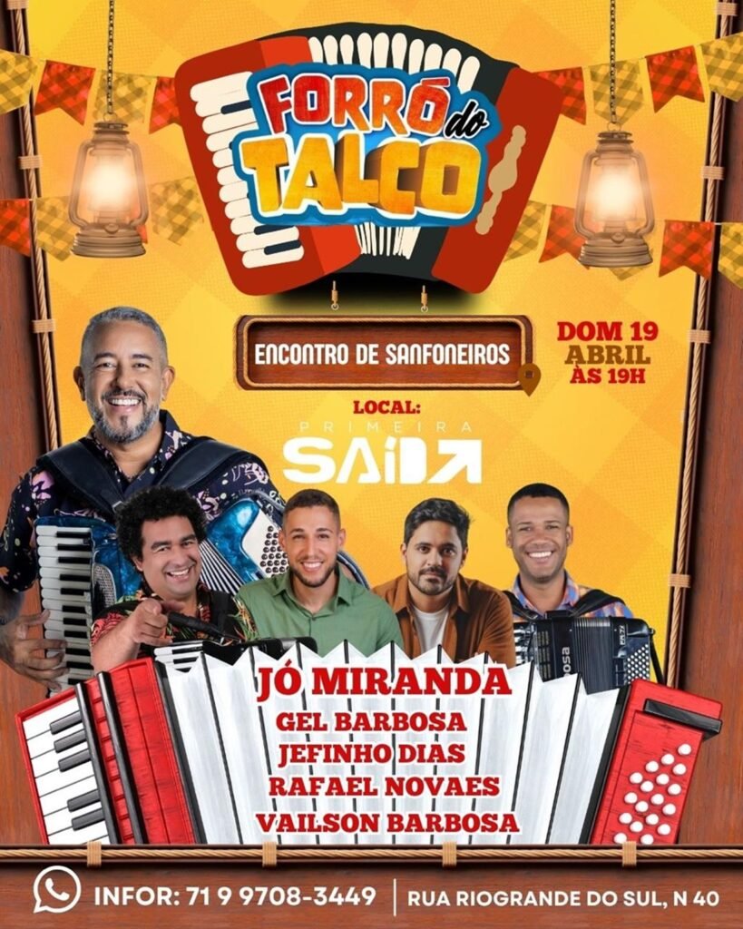 O Forró do Talco acontece neste domingo (19), às 19h, na Primeira Saída, na Pituba, sob o comando do cantor e sanfoneiro Jó Miranda. A edição será dedicada a um encontro de sanfoneiros e contará com as participações de Gel Barbosa, Jefinho Dias, Rafael Novaes e Vailson Barbosa.
