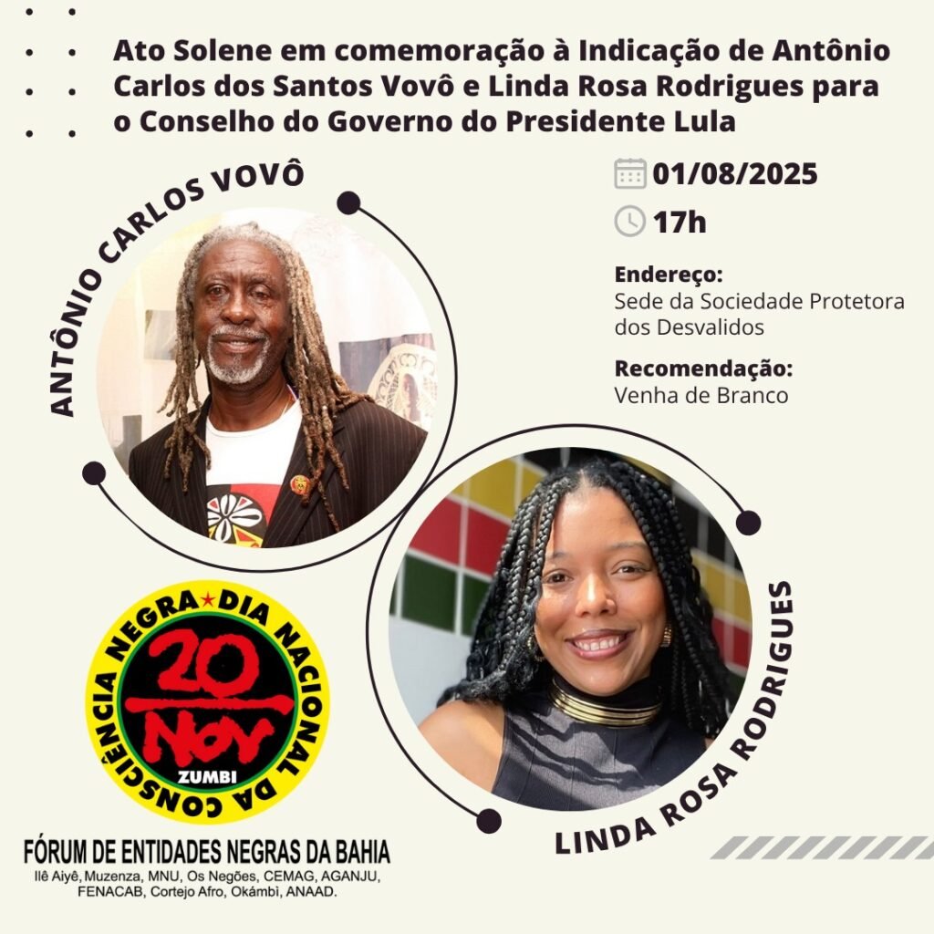 O Fórum de Entidades Negras da Bahia – FENEBA realizará um ato solene no dia 1º de agosto de 2025, às 17h, na Sociedade Protetora dos Desvalidos, em Salvador.
