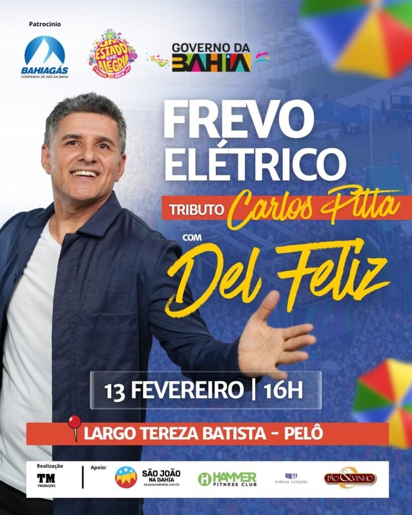 O espetáculo Frevo Elétrico – Tributo a Carlos Pitta, com Del Feliz, acontece no dia 13 de fevereiro, às 16h, no Largo Tereza Batista, no Pelourinho, em Salvador. A apresentação integra a programação do Carnaval da Bahia – Um estado de alegria, com patrocínio da Bahiagás e apoio do Governo da Bahia.