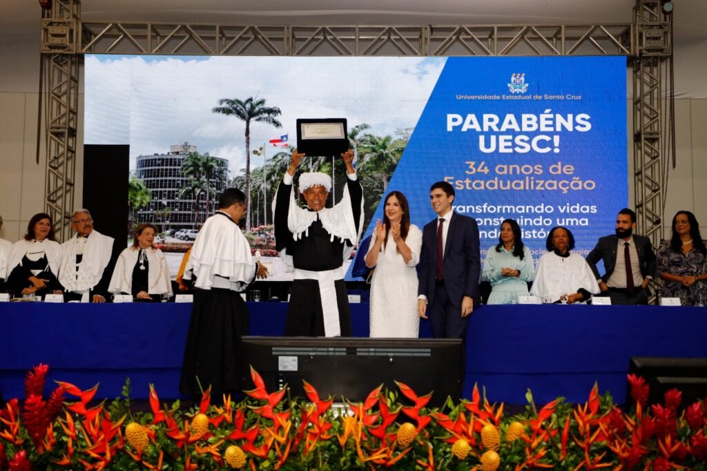 Nesta sexta-feira (5), a Universidade Estadual de Santa Cruz (Uesc) comemorou 34 anos de estadualização com um marco histórico: a outorga do título de Doutor Honoris Causa ao governador Jerônimo Rodrigues, que se torna o primeiro governador, em exercício da função, a receber a honraria na história da instituição. A sessão solene especial realizada pelo Conselho Universitário (Consu) celebrou a trajetória da universidade e reconheceu personalidades que contribuem de forma significativa para o desenvolvimento da Bahia e do país.