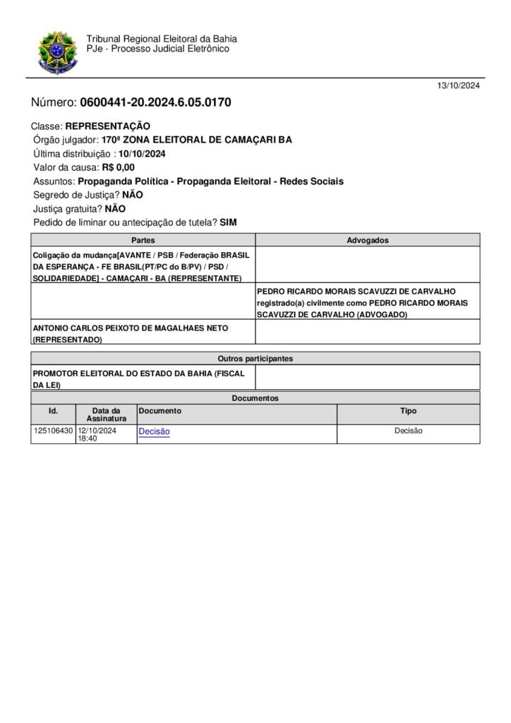 Número: 0600441-20.2024.6.05.0170 Classe: REPRESENTAÇÃO Órgão julgador: 170ª ZONA ELEITORAL DE CAMAÇARI BA Última distribuição : 10/10/2024 Valor da causa: R$ 0,00 Assuntos: Propaganda Política – Propaganda Eleitoral – Redes Sociais Segredo de Justiça? NÃO Justiça gratuita? NÃO Pedido de liminar ou antecipação de tutela? SIM
