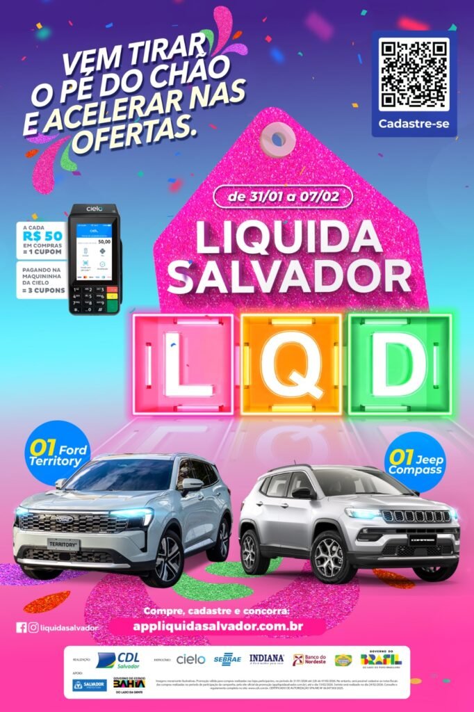 A maior promoção do comércio de Salvador já tem data marcada. A 28ª edição da Liquida Salvador, campanha anual da CDL Salvador e parceiros, acontece até 7 de fevereiro, reunindo lojas em Salvador e Região Metropolitana com ofertas especiais e a chance de concorrer a dois automóveis zero quilômetro: um Jeep Compass Sport e um Ford Territory Titanium.
