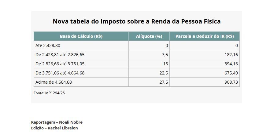 A MP corrige a primeira faixa da tabela e eleva o limite de aplicação da alíquota zero, que passará de R$ 2.259,20 para R$ 2.428,80.