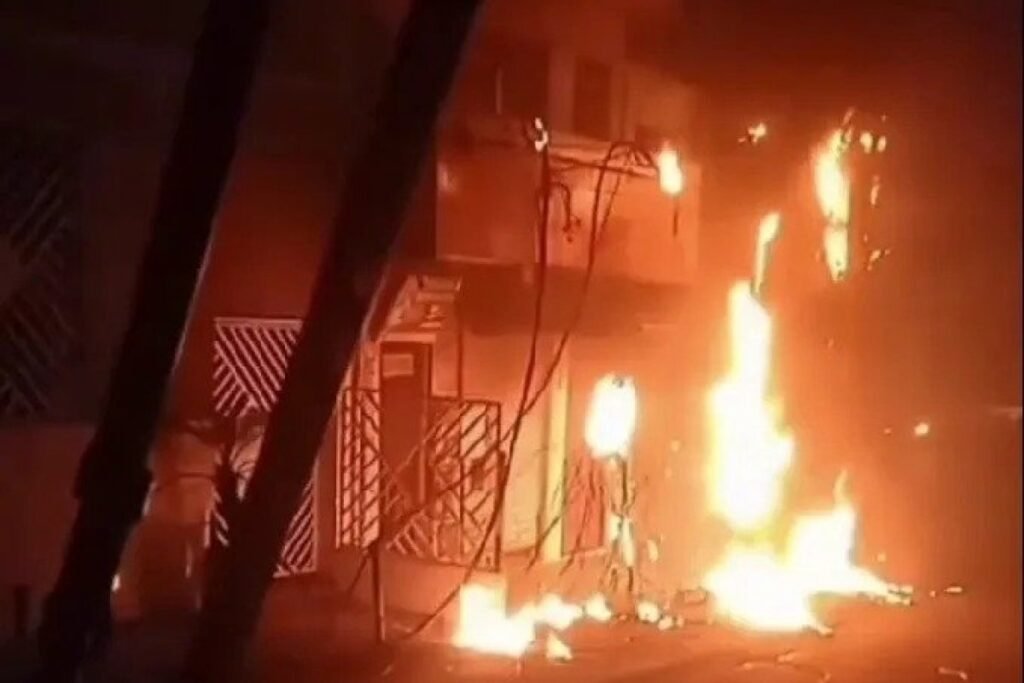 Em imagens feitas por moradores, é possível ver que as chamas nas fiações atingiram um imóvel. Não há detalhes sobre o prejuízo gerado.