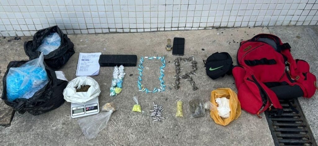 A guarnição da 12ª CIPM realizava rondas na localidade, quando avistou uma mulher e um homem em atitude suspeita. Quando os policiais deram a voz de abordagem, ela fugiu, mas foi alcançada pelos militares. Na abordagem, a suspeita foi flagrada com 25 pinos e 20 sachês de cocaína,15 pinos de crack,14 embalagens com maconha, 17 frascos de droga sintética e dinheiro em espécie. Já com o homem, nada foi encontrado.