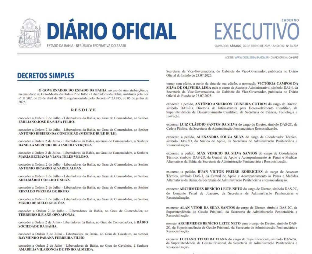 A mais alta honraria concedida pelo Governo do Estado da Bahia será entregue pelo governador Jerônimo Rodrigues nesta quinta-feira (31), às 18h, durante solenidade no Museu de Arte Contemporânea da Bahia (MAC Bahia), localizado no bairro da Graça, em Salvador. Na ocasião, 18 personalidades e instituições receberão a Medalha da Ordem 2 de Julho – Libertadores da Bahia, em reconhecimento à atuação em defesa da liberdade, da democracia e dos direitos do povo baiano.