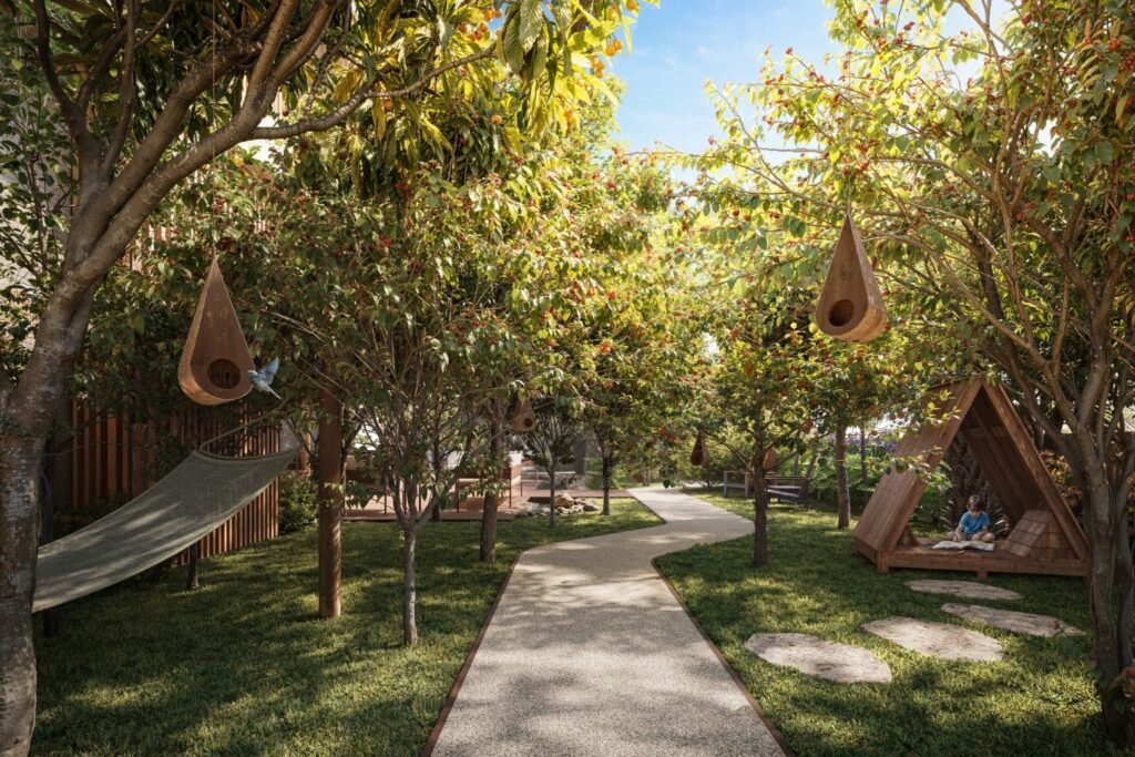 Integrando esse ambiente de conexão profunda com a natureza, Ricardo Farias propõe uma arquitetura biofílica, que reproduz padrões e formas do mundo natural. Com apartamentos de 2 suítes e lavabo, com até 75,26m², o projeto traz lago natural, espaço de faz-de-conta voltado para crianças, recanto animal para pets, quadra esportiva, academia, área de foco, empório com loja de conveniência, espaço solar, espaço gourmet, espaço silêncio com macas para tratamentos e ofurô, varandas com jardineiras de vegetação nativa e uma fachada ativa que aproxima o empreendimento da vida urbana. “Acreditamos que a verdadeira arquitetura vai além de projetar espaços. Ela cria experiências de vida. O Bosque Caminho das Árvores traduz essa visão ao unir design contemporâneo e essência natural, oferecendo um morar equilibrado, humano e conectado ao verde”, explica Farias.
