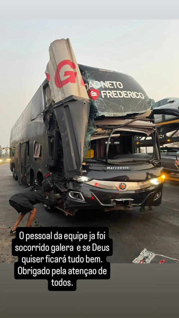 A assessoria da dupla sertaneja disse que os músicos estão bem. O cantor Frederico publicou uma imagem da frente do ônibus, que ficou bastante danificado com a batida, e disse que todos foram socorridos. “O pessoal da equipe já foi socorrido, galera, e se Deus quiser, ficará tudo bem”, disse ele.