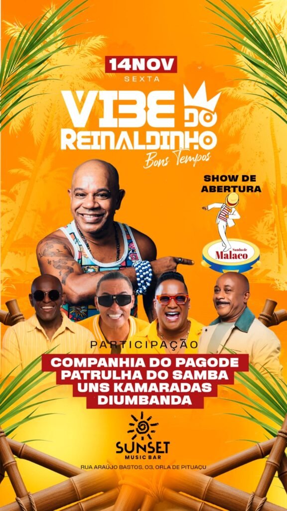 Os grupos Patrulha do Samba, Uns Camarada, Companhia do Pagode e De Umbanda estão confirmados na segunda edição da Vibe do Reinaldinho – Bons Tempos, que acontece no dia 14 de novembro (sexta-feira), a partir das 14h, no Sunset Music Bar, Pituaçu. O evento, comandado pelo cantor Reinaldinho, ex-integrante do Terra Samba, celebra os clássicos do pagode baiano e promete reunir o público em uma tarde de dança, alegria e nostalgia.
