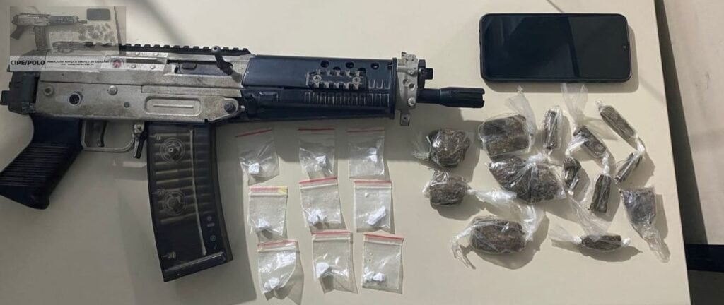 Os PMS realizavam rondas na região, quando avistaram dois adolescentes. Ao serem abordados foram encontrados com eles, um simulacro de arma de fogo portátil, 13 papelotes de cocaína e nove buchas de maconha.