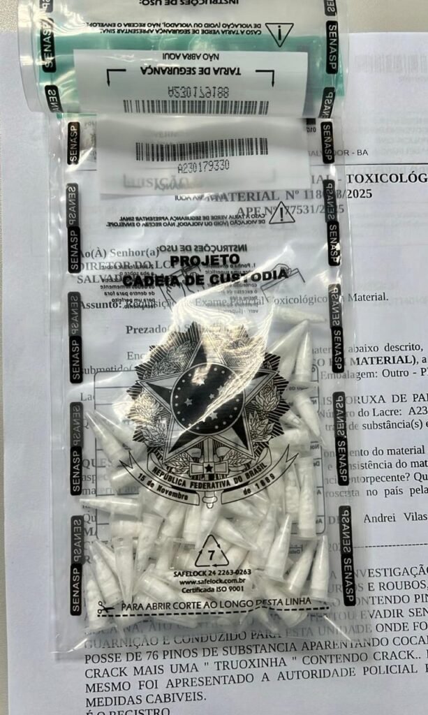 Durante diligências na região, investigadores avistaram o suspeito carregando um saco contendo drogas. Ao perceber a aproximação da equipe, ele tentou fugir, mas foi alcançado e contido. Na abordagem, foram apreendidos 76 pinos de cocaína, 22 pedras e uma porção de crack.
