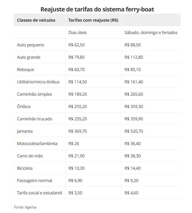 A Agerba também aprovou o reajuste de 4,50% das tarifas do Serviço Público de Transporte Hidroviário Intermunicipal de Passageiros, entre os municípios de Salvador e Ilha de Itaparica, operado pelo sistema ferry-boat.