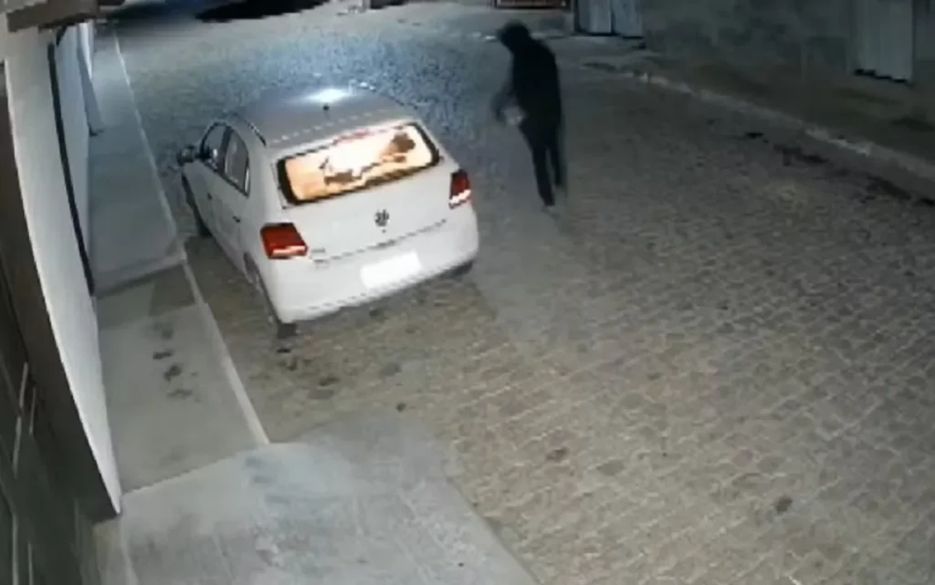 O caso ocorreu por volta das 2h30. As imagens mostram o suspeito se aproximando do carro, quebrando o vidro traseiro com um martelo, despejando um líquido inflamável e, em seguida, ateando fogo.