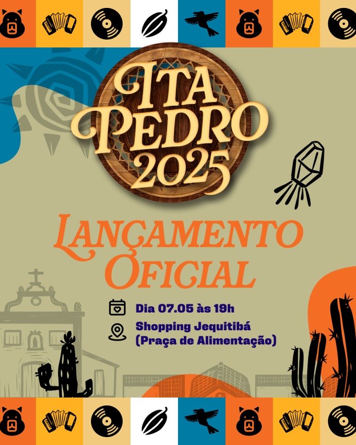 A Prefeitura de Itabuna, através da Fundação Itabunense de Cultura e Cidadania (FICC), confirma o lançamento oficial do Ita Pedro 2025, para quarta-feira, dia 7, às 19h, no Shopping Jequitibá.