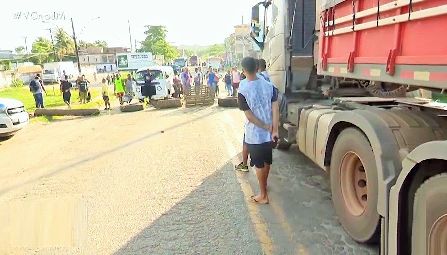 Em vídeo que circula nas redes sociais, é possível ver que a via está bloqueada e que moradores atearam fogo em galhos de árvores e objetos.