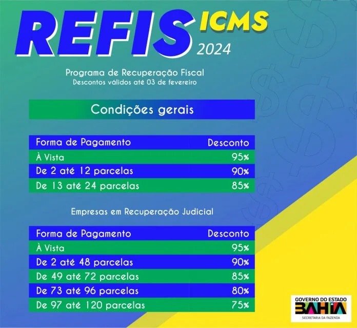 São passíveis de regularização junto ao fisco estadual os débitos com ICMS decorrentes de fatos geradores ocorridos até 31 de dezembro de 2023. Todas as informações sobre o Refis ICMS Bahia estão disponíveis no site www.sefaz.ba.gov.br, incluindo um simulador de débitos.