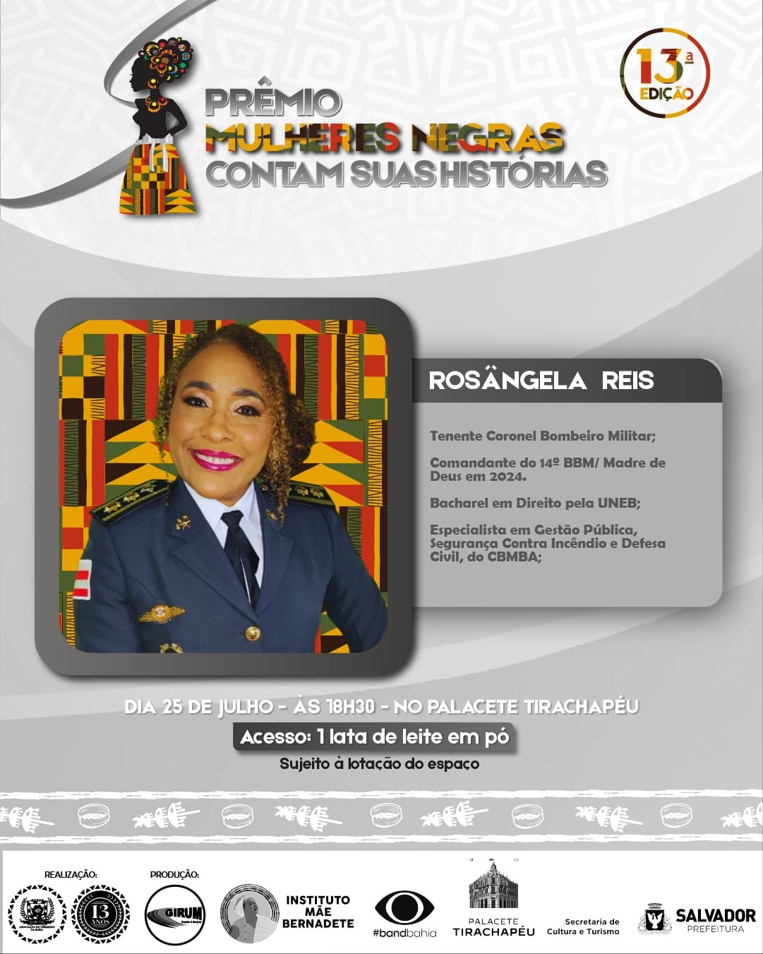 Tenente-coronel do Corpo de Bombeiros integra lista de dez lideranças reconhecidas por atuação social e profissional A tenente-coronel Rosângela Pereira Reis do Nascimento foi uma das mulheres homenageadas na 13ª edição do Prêmio Mulheres Negras Contam Suas Histórias. Natural de Salvador, Rosângela construiu uma carreira sólida no Corpo de Bombeiros