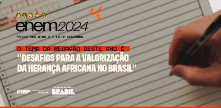 O tema da redação do Exame Nacional do Ensino Médio (Enem) 2024 é “Desafios para a valorização da herança africana no Brasil”.