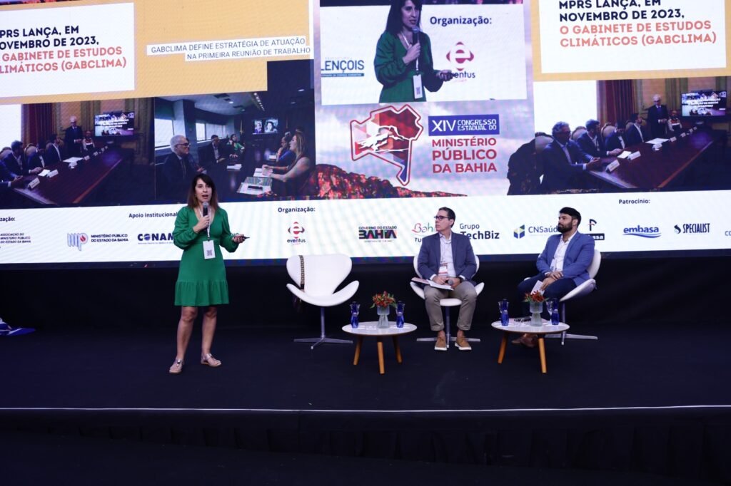 O primeiro painel da manhã discutiu a atuação do Ministério Público diante de grandes desastres naturais, com mediação do coordenador do Centro de Apoio Operacional do Meio Ambiente do MPBA (Ceama), promotor de Justiça Augusto César Matos. A promotora de Justiça do MP do Rio Grande do Sul Ximena Ferreira relatou a experiência do Gabinete de Estudos Climáticos (GabClima), instalado em Porto Alegre após as fortes enchentes que devastaram o estado em setembro de 2023, e defendeu uma atuação rápida, articulada e resolutiva por parte do MP. O superintendente do Iphan na Bahia, Hermano Guanaes Queiroz, destacou a importância de considerar o patrimônio cultural como vítima em situações de desastre.