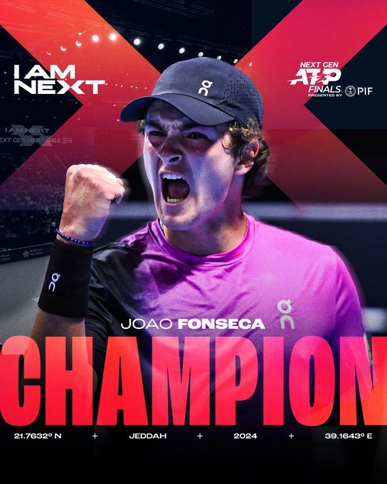 O brasileiro João Fonseca conquistou, neste domingo (22) em Jedá (Arábia Saudita), o título do Next Gen ATP Finals, competição que desde 2017 reúne os oito melhores tenistas de até 20 anos do circuito mundial. O atleta do Brasil alcançou o feito ao derrotar o norte-americano Learnen Tien por 3 sets a 1 (parciais de 2/4, 4/3, 4/0 e 4/2).