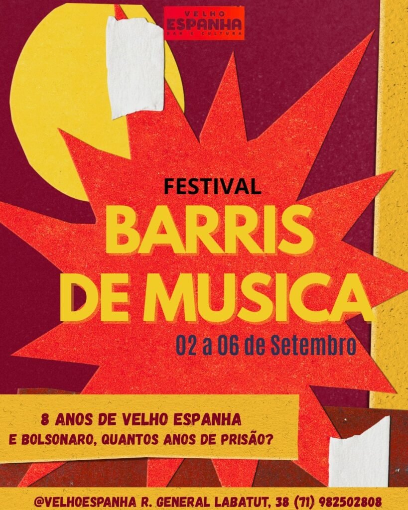 O Velho Espanha Bar e Cultura promove, entre os dias 2 e 6 de setembro de 2025, o VI Festival Barris de Música, reunindo artistas da cena baiana em uma programação que contempla chorinho, MPB, jazz, chula e samba. Além dos shows, o espaço transmitirá ao vivo o julgamento do Supremo Tribunal Federal sobre a tentativa de golpe de Estado atribuída ao ex-presidente Jair Bolsonaro, atualmente inelegível.